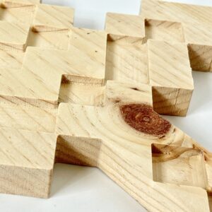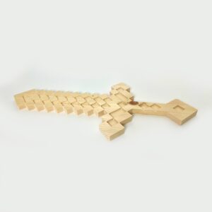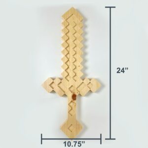 This wooden pixel sword was hand-designed in CAD but precision cut with a computer-controlled router. It measures 24 inches tall by 10.75 inches wide by 3/4 inch thick. It features a straight, but rounded edge, handle for a comfortable grip. It is shipped in a natural wood finish (unfinished) which is ready to be either stained or painted.